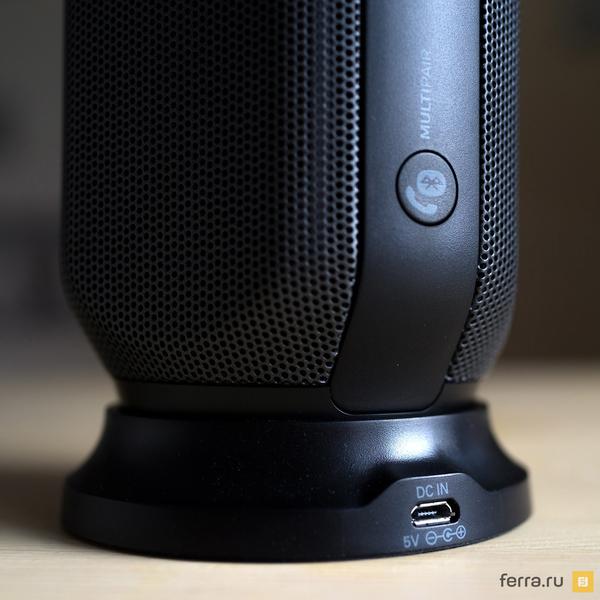Сверху у BT6600B находится упомянутая ручка, снизу – резиновое основание с небольшими выступающими ножками, а также разъем для установки в док-станцию. На нижней поверхности самой док-станции тоже есть аналогичная резинка, благодаря которой колонка не ездит по столу, играя на максимальной громкости.