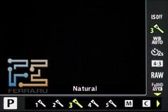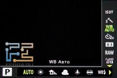 В случае необходимости быстрой съёмки в формате JPEG в принципе можно обойтись автоматическим режимом, тогда как остальные системные камеры при подобном освещении требуют либо установки соответствующего пресета либо ручной установки. Из пресетов доступны следующие: солнечно, облачно, лампа накаливания, флуоресцентная лампа, вспышка, пара контейнеров ручной настройки и ручной выбор цветовой температуры, что особо актуально при использовании разнообразного искусственного освещения с известной цветовой температурой, причём для всех настроек, за исключением последней, предусмотрена точная настройка по шкалам A-G (по 15 значений), но к сожалению, результат тонкой настройки в реальном времени не виден, поэтому для подстройки приходится по несколько раз заходить в соответствующий пункт меню, который находится довольно глубоко.