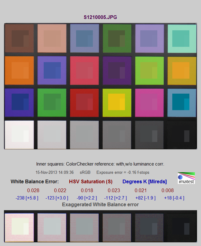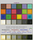 На изображениях в каждом поле малый внутренний прямоугольник является эталонным цветом, а внутренний квадрат — полученным камерой, но приведенным по яркости и контрасту, внешний квадрат — необработанная область, полученная с камеры. Красные числа обозначают отклонения цвета по шкале S в цветовом пространстве HSV, а синие — в градусах Кельвина.