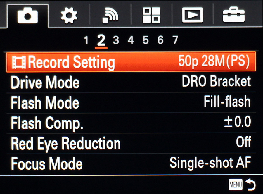 Sony A7 порадует профессионалов возможностью гибкой настройки множества клавиш. Перепрограммируемых кнопок здесь девять, а число различных функций достигает 47. Быстрое меню представляет собой двухрядную таблицу из шести пунктов в каждом ряду. Меню отображается внизу дисплея, а не по бокам, как в других камерах Sony. Состав пунктов меню также может быть перенастроен. Селектор режимов предлагает два пункта с предустановленными настройками съемки, так называемые Memory Recall. Кстати, у Sony RX1 таких пунктов было три. Практически все меню выдержанно в строгой черно-белой гамме. Оранжевым цветом подсвечиваются лишь активные в данный момент пункты. Привыкнуть к расположению той или иной информации на дисплее и схеме управления можно буквально за один день. Кстати, для тех кто переходит на полный кадр с беззеркалок NEX есть возможность оставить привычный вид основного меню.