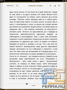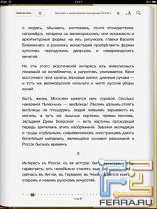 Читать книги с iPad тоже очень приятно. Как всегда, поражает внимание к каждой мелочи. Для листания используется разная анимация, в зависимости от того, с какой стороны вы цепляете страницу. Практической пользы от этого ноль, удобства тоже не добавляется, но смотреть каждый раз приятно. Но из-за чрезмерного веса iPad подходит только на роль домашней читалки. Читать с него на ходу, как уже говорилось, не оптимально из-за веса.