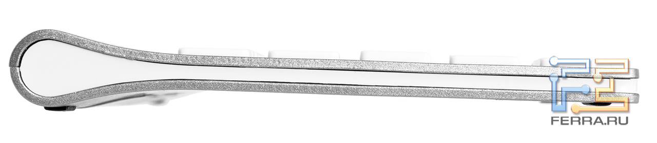 На боковых торцах ничего нет. Как можно заметить по снимку в профиль, клавиши клавиатуры прилично выступают над ее поверхностью. У них достаточно большой ход, нетипичный для ноутбуков, нажатие мягкое и приятное.