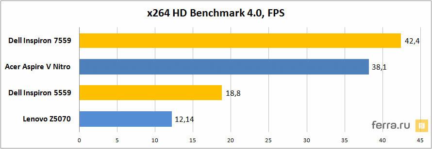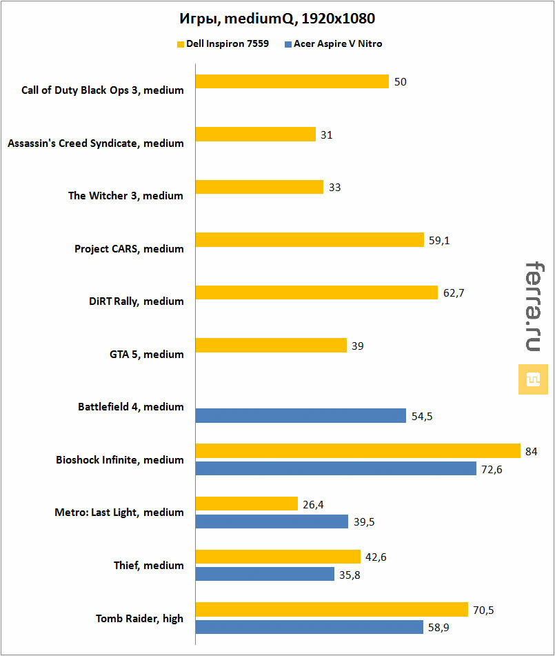 Старшего героя в нашем тесте мы будем сравнивать с Acer Aspire V Nitro. Сравнение, кстати, будет интересно — игровая модель Acer является аккурат «гостем из прошлого» со сходным Intel Core i7 (только уже Haswell, а не Skylake) и всё той же графикой GTX 860M/960M, но в старой версии с 2 ГБ GDDR5. Поглядим, прыгнет ли Inspiron 7559 «выше головы», когда речь пойдёт о родственных по классу и мощности соперниках.