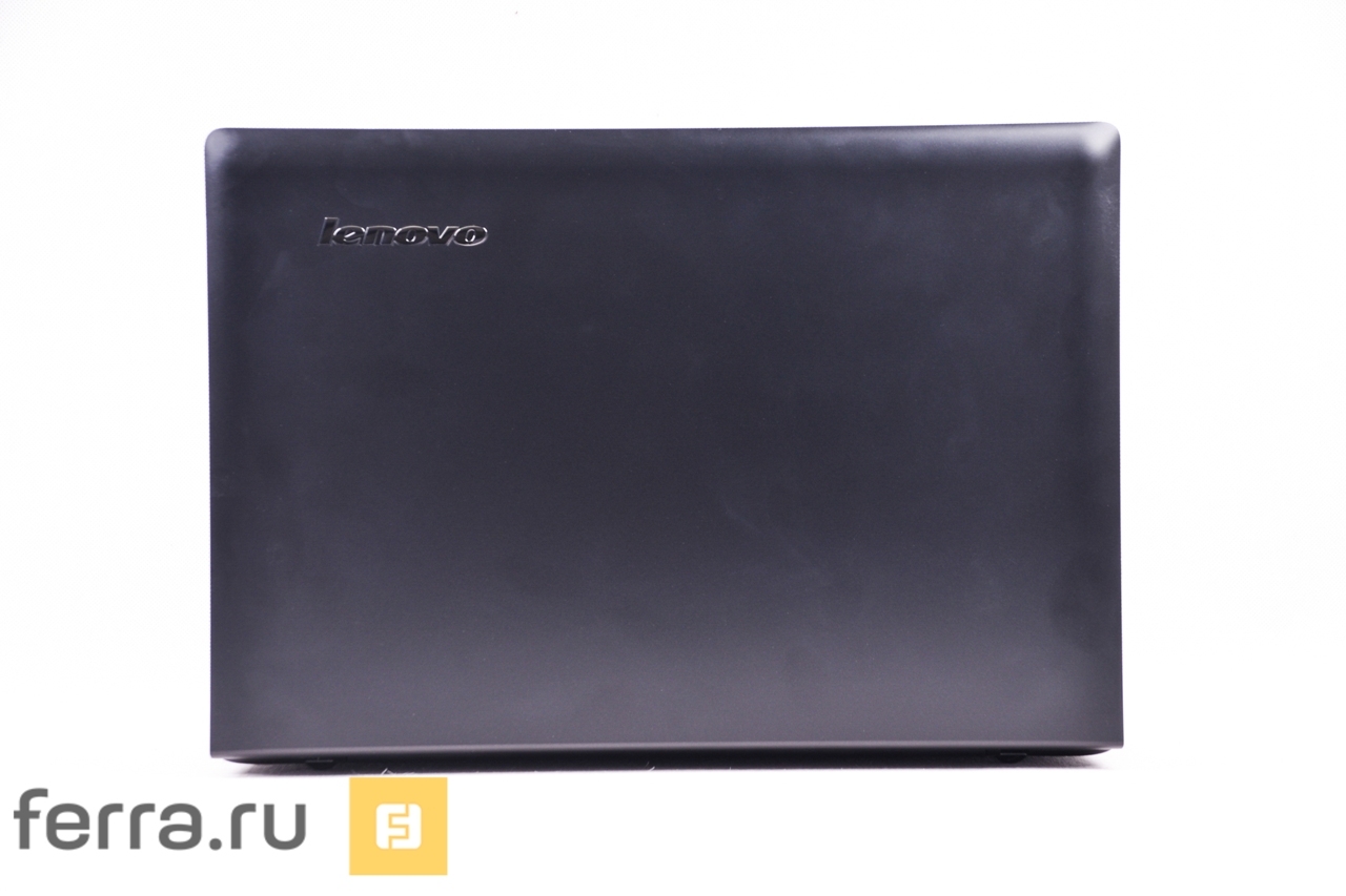 Крышка ноутбука выглядит откровенно скучно. Хромированный логотип Lenovo немного выручает, но разглядеть за кондовым матовым пластиком какое-либо подобие рисунка не удастся, как и определиться с цветом крышки: чёрный, серый, тёмно-синий? Зато внешняя скромность компенсируется практичностью материала: стоит провести по крышке даже влажной рукой, как спустя минуту борозды от пальцев практически бесследно «испаряются». Радует и прочность крышки: даже под серьёзным давлением пластик не прогибается, а Full HD дисплей остаётся на почтенном расстоянии от клавиатуры. Угол раскрытия едва превышает 135 градусов — довольно-таки средний результат.