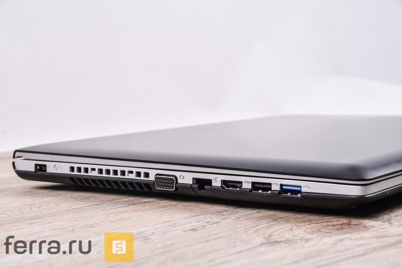 Вентиляционные отверстия расположились на левой грани и дне ноутбука. А рельефный выступ на рабочей поверхности с надписью Dolby заключает в себе вовсе не набор роскошных стереодинамиков, а аккумулятор, расположенный вровень с дном Z5070.