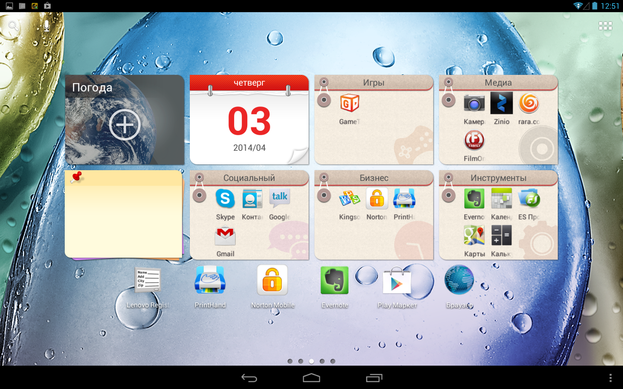 Lenovo IdeaTab S6000 работает под управлением Android 4.2.2. В случае скромных китайских производителей нам оставалось бы лишь констатировать, что операционная система осталась нетронутой и закрыть этот параграф. Но в Lenovo не сидели сложа руки и основательно напичкали планшет предустановленными программами, а также пачкой симпатичных виджетов.
