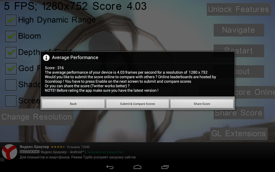 Графическая подсистема IdeaTab S6000 представлена ускорителем PowerVR SGX544 в двухъядерной модификации. Его мощность оставляет желать лучшего — за пределами разрешения 800 x 480 пикселей чип демонстрирует смехотворно низкую производительность при выводе трёхмерной графики. Его потенциал соответствует примерно уровню Adreno 220 или Tegra 2, которые встречались в моделях HTC Sensation, Samsung Galaxy Tab 10.1 P7500 и прочих. Да, в 2011 году это были неплохие модели, но сегодня восхищаться уже нечем.