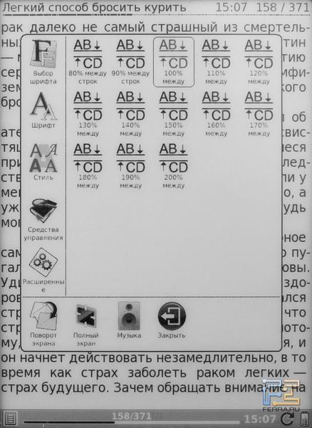 Если с поддержкой форматов проблем нет, то с настройками чтения не всё гладко. Например, стоило бы доверить пользователю выбор областей и кнопок, отвечающих за перелистывание страниц. Нет возможности пролистать книгу сразу страниц на 10 вперед, нельзя отключить переносы. Можно выбрать шрифт, размер шрифта и интерлиньяж, но делается это не на одном экране, а на трех разных. Неудобно, много лишних движений.