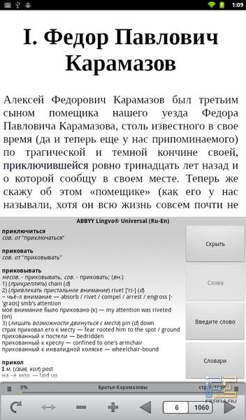 О самом главном мы не забыли, нет. Для чтения на PocketBook предустановлено сразу два приложения. Первое — от самого PocketBook, и его мы уже видели на старшем брате A7 — планшете A10. Программа проста и довольно удобна, интегрирована со словарём ABBYY Lingvo (несколько словарей предустановлено, остальные ждут в магазине), умеет читать книги вслух, позволяет создавать заметки в книгах, а, кроме того, даёт доступ сразу в два украинских книжных интернет-магазина — Obreey и BookLank. Незалежность этих магазинов не мешает им продавать литературу на русском и вообще работать с россиянами. Словом — пригодятся. Наконец, программа имеет своего наместника на рабочем столе — виджет в виде полки с книгами, которые вы недавно читали.