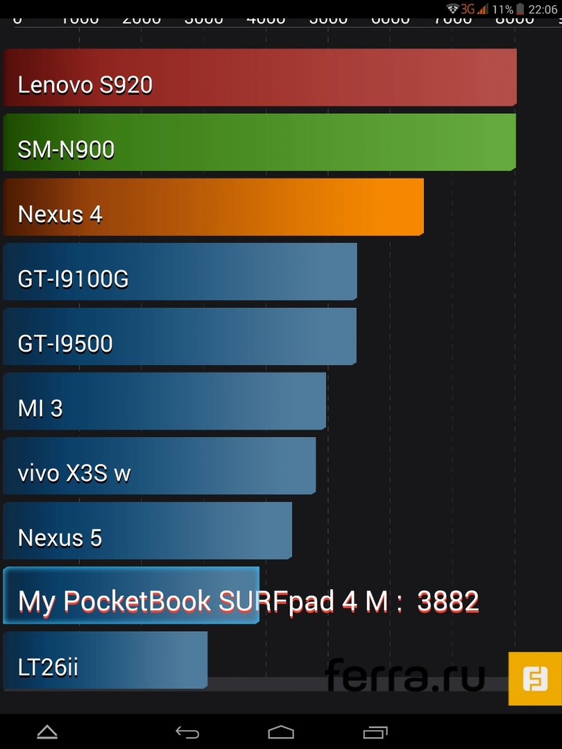 Максимальный уровень яркости дисплея составляет 345,9 кд/м2, что заметно меньше пиковых для iPad Mini 440 кд/м², однако контрастность в соотношении 730:1 в сравнении с планшетом из Купертино, оказывается выше — iPad способен выдать максимум 600:1. Насыщенность чёрного цвета в нашем SURFpad выглядит типично для IPS-дисплеев, тогда как образцовыми в этой дисциплине по-прежнему остаются матрицы Super AMOLED.