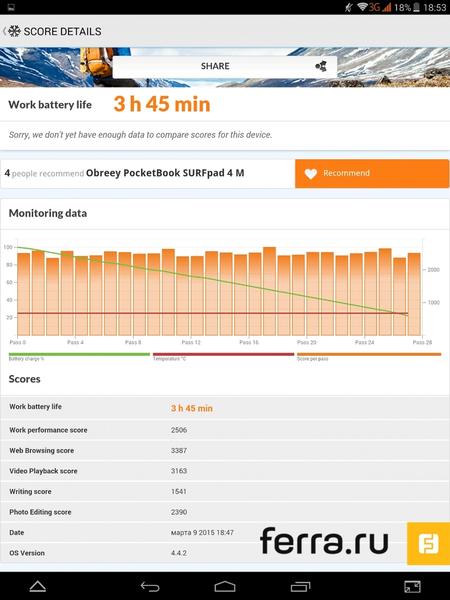 Аккумулятор ёмкостью 4000 мАч для восьмиядерного процессора — не самый лучший выбор. PocketBook SURFpad 4 M разряжается намного быстрее, чем, к примеру, аналогичный по размеру Lenovo TAB S8-50LC, основанный на четырёхъядерном Intel Atom Z3745 при аккумуляторе ёмкостью 4290 мАч.