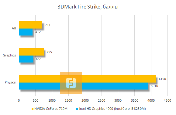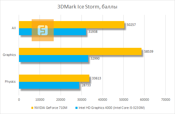 В графических тестах в этот раз мы сравнили не два ноутбука, а встроенную и дискретную графики главного героя обзора. В итоге NVIDIA GeForce 710M легко обошла Intel HD Graphics 4000, поэтому, видимо, low-end мобильных видеокарт ещё слишком рано хоронить. Но посмотрим, что покажут остальные тесты.