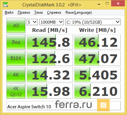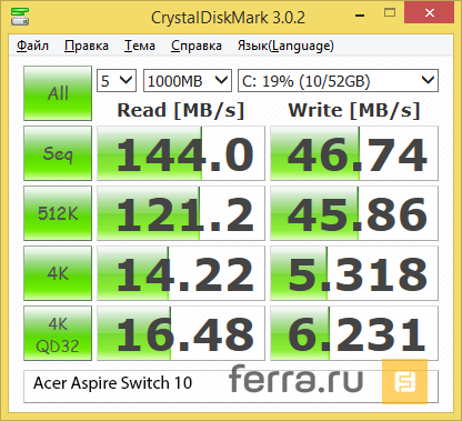 Накопитель планшета Acer Aspire Switch 10 демонстрирует в разы большую производительность, нежели оный в ASUS Transformer Book T100TA. А значит, Switch 10 будет значительно быстрее откликаться на действия пользователя и меньше заставлять себя ждать. Если сравнивать eMMC-накопитель со средним жёстким диском типичного ноутбука, то последний на четверть лучше покажет себя при линейной записи файлов и почти вдвое хуже во время чтения. И, как видно из графиков, и сжимаемые файлы, и уже сжатые (mp3, jpg, всевозможные архивы и т.п.) для eMMC на одно лицо — скорость чтения/записи от степени сжимаемости никак не меняется.