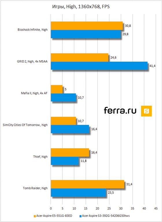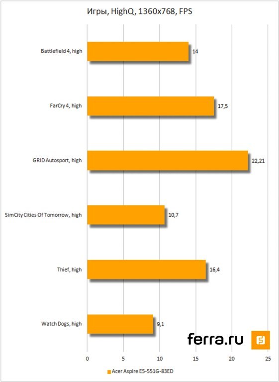 Хорошие новости — Bioshock Infinite, GRID 2 и Tomb Raider можно будет успешно пройти на Acer Aspire E5-551G. Плохие — производительность во всех остальных играх по-прежнему осталась скромной. И дело тут даже не в видеокарте, которая справилась со своей задачей на 100%, и по возможности задействовала Mantle API в Thief и Battlefield. Дело в процессорной части, которая, не отличаясь высокой производительностью сама по себе, зачастую оказывается не в состоянии поддерживать даже «крейсерские» 1,8 ГГц на всех четырёх ядрах.