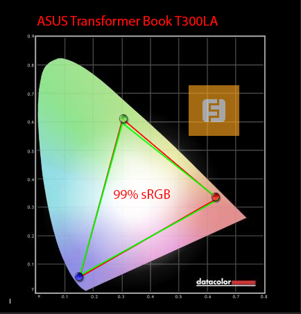 Цветовой охват дисплея ASUS T300LA почти полностью совпадает с международным стандартом sRGB. При этом среднее цветовое отклонения составляет всего 1,14, так что такой дисплей вполне подходит даже для обработки изображений. Хотя вряд ли найдется много желающих воспользоваться подобным устройством по такому назначению.