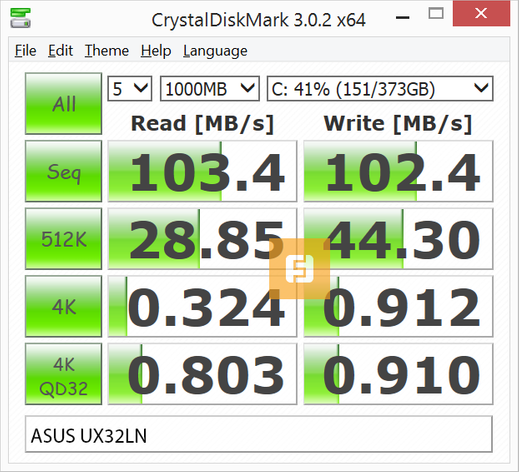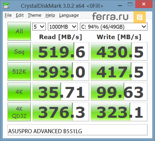 Разница в тактовой частоте и объёма кэш-памяти L3 в ноутбуке ASUSPRO не сыграла ровным счётом никакой роли — лишь в однопоточном режиме Cinebench отметил более высокий потенциал Core i7-4650U по сравнению с Core i5-4200U, установленным в Zenbook UX32LN. Остальные тесты ноутбуки прошли с разницей на уровне погрешности.