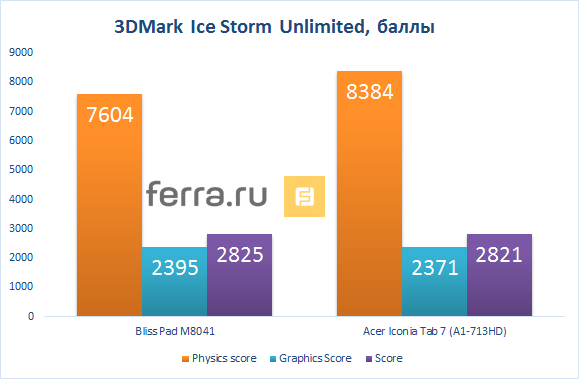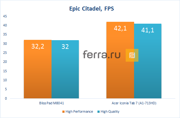 Последний планшет с наиболее близкой стоимостью, посетивший нашу редакцию, был Acer Iconia Tab 7 (A1-713HD). С ним мы и сравним результаты менее именитого Bliss Pad M8041.