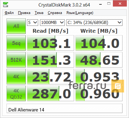 Результаты тестирования Dell Alienware 14 в x264 HD Benchmark 4.0