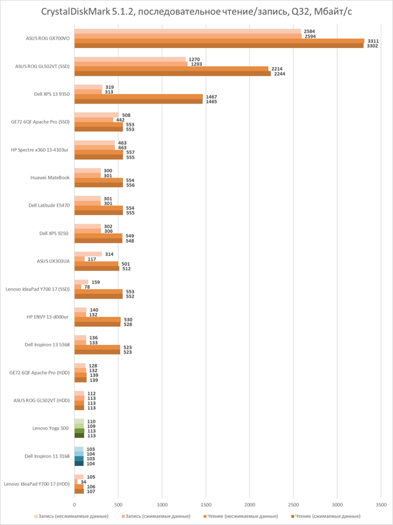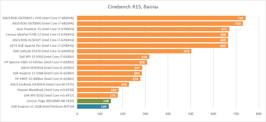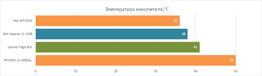 ОЗУ в Dell Inspiron 11 3168 всего 4 ГБ и это максимальный объём для модели. Для казуальных задач будет достаточно, да и редактор изображений вполне спокойно будет работать, если не пытаться скормить ему одновременно много файлов. Контроллер памяти, встроенный в данную систему-на-кристалле, не даёт Intel повода для гордости. Более того, по скорости чтения/записи лэптоп едва не проигрывает «противнику» на базе APU AMD (Lenovo Yoga 500 c AMD A8-7410), которая никогда не придавала этому аспекту большого внимания. А вот по общей производительности Dell Inspiron 11 3168 на Intel Pentium N3710 всё же проигрывает этому трансформеру, но за счёт меньшей производительности видеоядра.