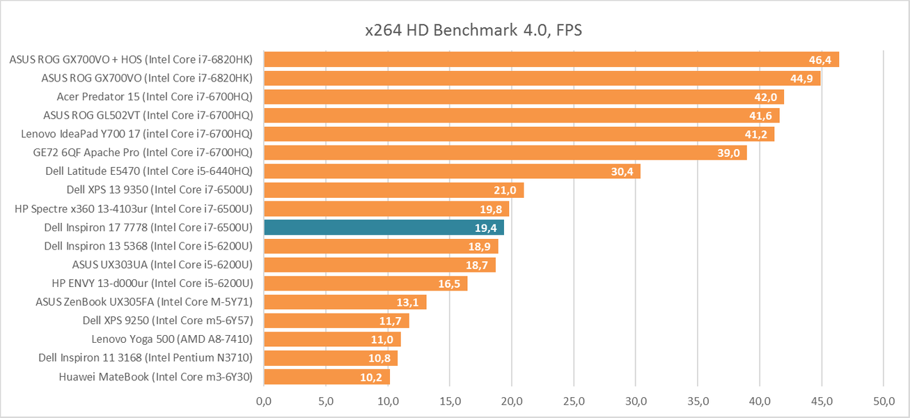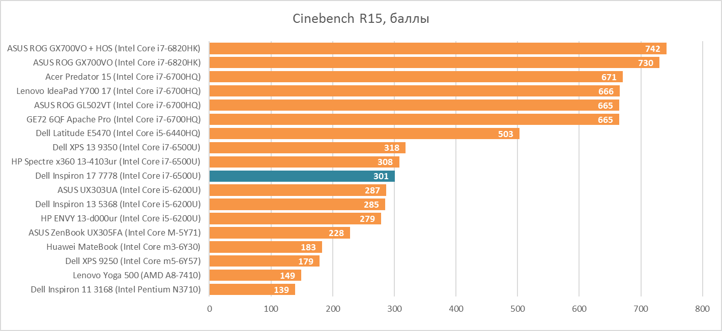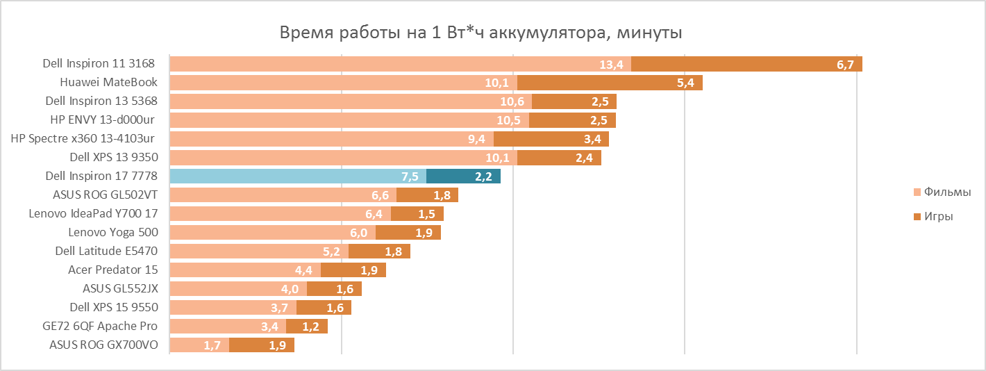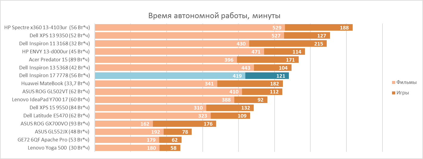 Время автономной работы — одно из приоритетных направлений Intel в линейках процессорах последних лет. К примеру, еще пару лет назад разница во времени работе без подзарядки при просмотре фильмов между ноутбуками на базе 15-ти и 45-ваттным процессоров Intel была более чем двукратной. А сейчас, посмотрите на график, Dell Inspiron 17 7778 хоть и работает очень долго за счёт 15-ваттного Intel Core i7-6500U и аккумулятора ёмкостью 56 Вт*ч, но игровой Lenovo IdeaPad Y700 17 c таким же огромным дисплеем, но с 45-ваттным Intel Core i7-6700HQ и аккумулятором на 60 Вт*ч проработал всего на 11% меньше. А именно на 20 минут меньше при просмотре HD-фильма, и на полчаса меньше в играх.