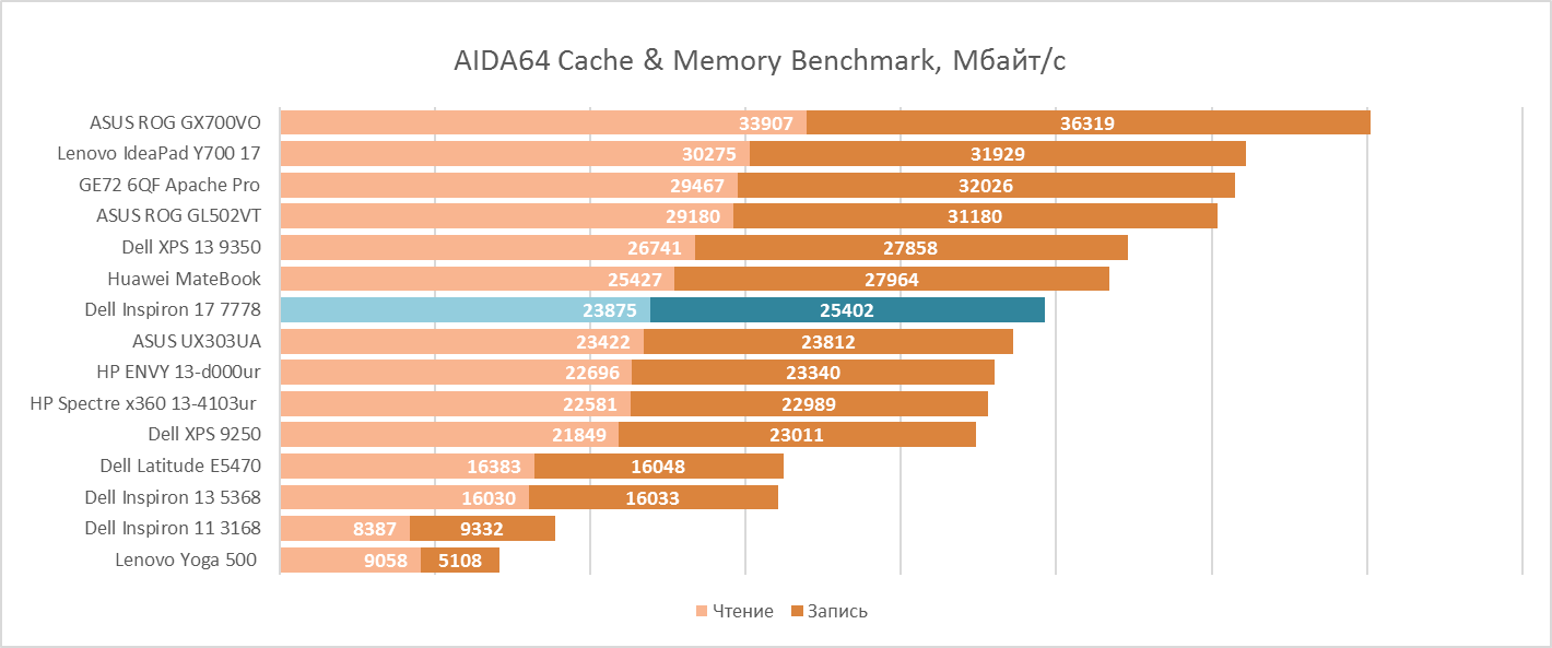 Оперативной памяти в нашем образце установлено 12 ГБ, а максимальный объём, с которым продаётся Dell Inspiron 17 7778, — 16 ГБ. Но и 12 ГБ сегодня — хороший показатель. Память относится к самому современному стандарту — DDR4 и работает на частоте 2133 МГц. И, как показывает бенчмарк AIDA64 Cache & Memory Benchmark, скорость работы у неё что надо.