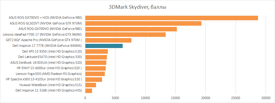 В результатах теста PCMark 8 Home, который оценивает общую производительность системы, ноутбук находится ровно посередине между «бюджетниками» и мощными игровыми системами.