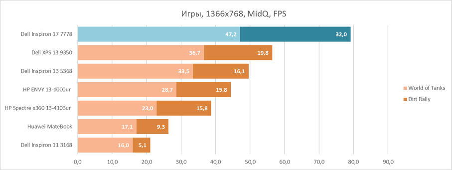 Как видно из диаграммы, использование NVIDIA GeForce 940MX делает жизнь владельца ноутбука с ней на борту счастливее, но кардинально картину не меняет. Однако, если без неё можно худо-бедно играть в World of Tanks и совсем нельзя в Dirt Rally, то с NVIDIA GeForce 940MX в Dirt Rally уже можно играть, а в «танчики» — даже с удовольствием. Но всё это в разрешении 1366х768. В Full HD смена кадров в секунду перестаёт быть плавной.