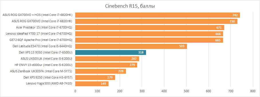 Под «капотом» Dell XPS 13 9350 встречается один из трёх современных низковольтных процессоров, разработанных специально для компактных лэптопов — Intel Core i5-6200U, Intel Core i7-6500U или Intel i7-6560U. Первый уже неоднократно встречался нам в тестах, теперь пришло время посмотреть, насколько «быстрее» его старший брат, Intel Core i7-6500U, которым оснащена наша конфигурация. По результатам процессорных тестов разница составляет от 12 о 23%, что, с одной стороны существенно, но, с другой, вряд ли будет бросаться в глаза. Если для вас действительно важна производительность, например, скорость кодирования видеороликов, то стоит брать совсем другой лэптоп. А если вы готовы немного подождать или вообще не планируете загружать ноутбук на все сто процентов, то можете спокойно брать Dell XPS 13 9350 хоть с Intel Core i7-6500U, хоть с Intel Core i5-6200U. А вот Intel i7-6560U имеет более производительное графическое ядро, но на тестах у нас еще не было, и заочно обсуждать его потенциал в играх мы не будем.