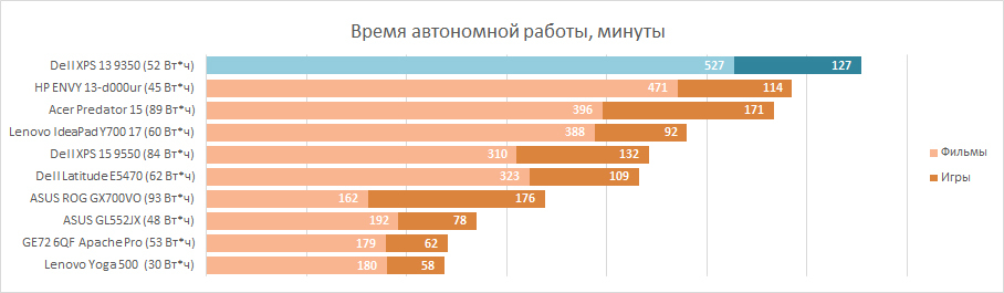 С выходом каждой новой линейки ультранизковольных процессоров Intel время работы ноутбуков от одного заряда аккумулятора приятно увеличивается.  Dell XPS 13 9350 оказался самым долгоиграющим среди лэптопов, которые прошли через наши руки за последние пару месяцев. Просмотр фильмов в HD-качестве, с включённым Wi-Fi и 53% яркости экрана без подзарядки длился почти девять часов. При полной яркости — примерно семь с половиной часов. Поиграть столько же, конечно, не удастся, лэптоп попросит подключить его к сети через два часа, что тоже неплохой результат.