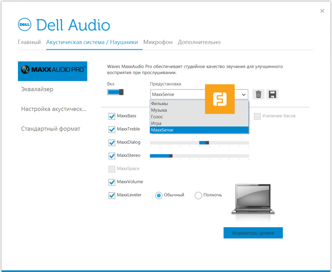 Диспетчер звука MaxxAudio Pro обзавелся лёгким рестайлингом и, приятно отметить, не бесполезен. Возможности настройки действительно очень широки, а предустановки эквалайзера неплохо борются с недостатками звучания в определённых жанрах. Но углубляться в тонкую настройку звука в каждом новом треке — удел терпеливых гиков, а сбалансированным, и главное, премиальным звучанием XPS 15 похвастаться не может.