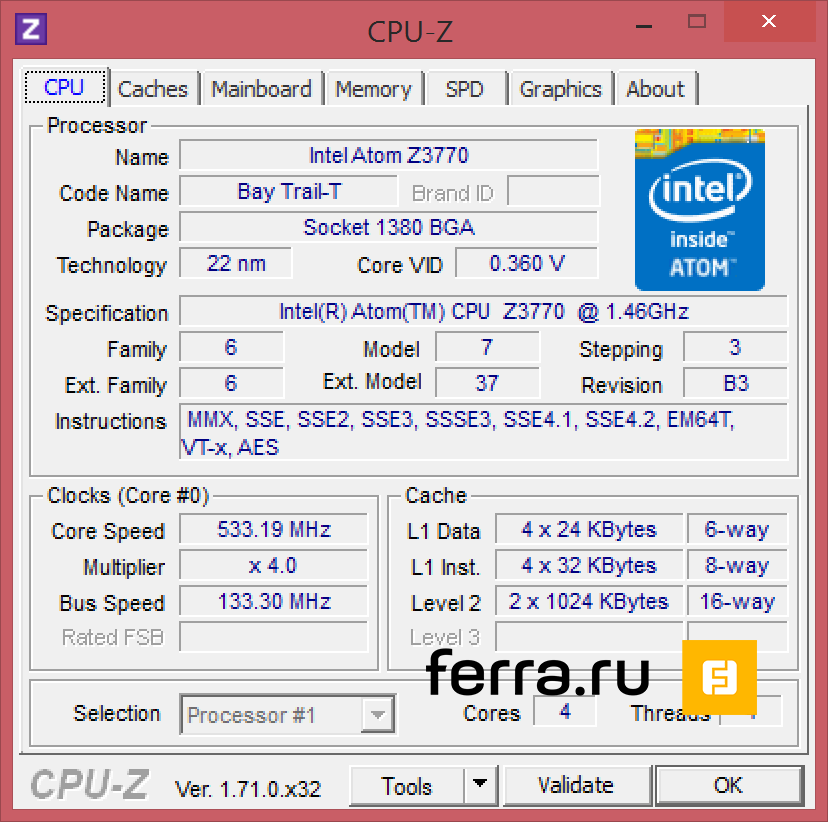 | Процессор | Intel Atom Z3770 (4 ядра/4 потока, 1460/2400 МГц) |