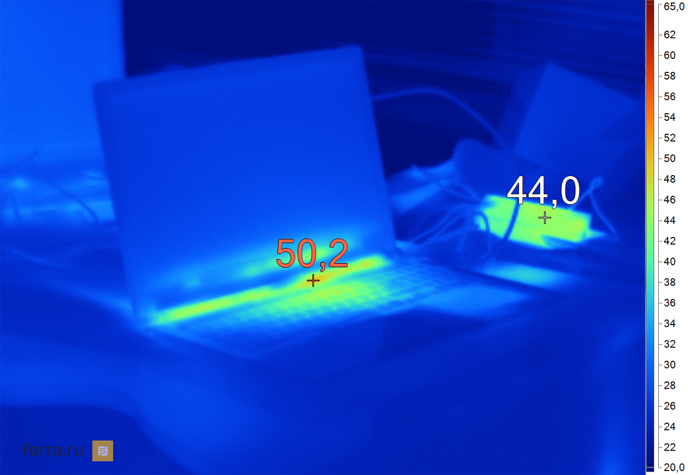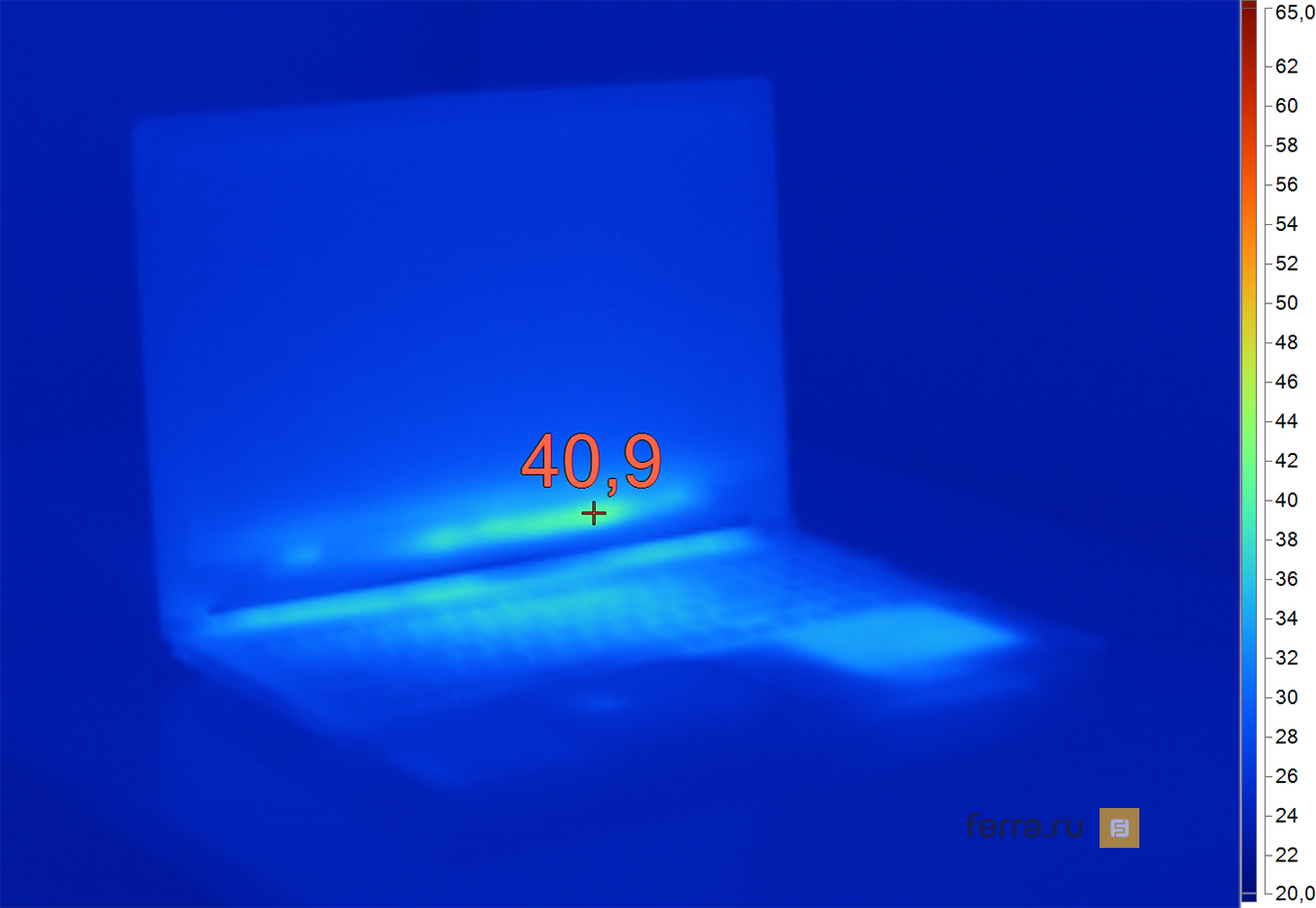 Что ещё может принести дискомфорт геймеру, кроме нестабильного FPS? Лишний шум и горячий корпус. Acer Aspire V Nitro работает заметно тише, чем можно от него ожидать, к тому же система охлаждения повышает обороты двух своих вентиляторов в самый последний момент, дабы лишний раз не раздражать пользователя. Температура корпуса, пока ноутбук простаивает, низкая, а когда дело доходит до игр, то греется в основном центральная часть клавиатуры. Но клавиши WASD лишь немного выше температуры поверхности кожи человека. Наибольший дискомфорт можно себе причинить только, прислонив к коленям решётку вентиляции ноутбука. Во-первых, так делать не надо, поскольку так вы «задушите» лэптоп, во-вторых, она способна нагреться аж до 63 градусов. Поэтому, играя в игры, Acer Aspire V Nitro лучше всего ставить не на колени, а на ровную поверхность, а лучше на специальную вентиляционную подставку для ноутбуков.
