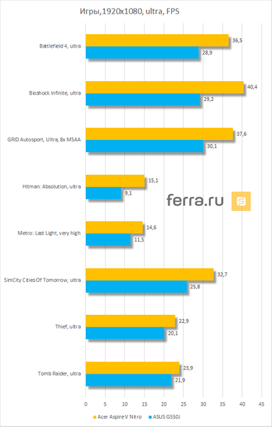 Игры, как ожидалось, почти повторили результат, показанный 3DMark’ом. На средних настройках Acer Aspire V Nitro опережал оппонента в среднем на 15%, на очень высоких настройках — на 29%. Максимум этого лэптопа — средние-высокие настройки в Full HD разрешении, но не максимальные, в них средний FPS находится ниже комфортного уровня. Однако всё зависит от конкретной игры — вы сами можете видеть это на графиках. Максимальная разница с ноутбуком на видеокарте 850M составила 16 кадров в секунду, минимальная же была иногда даже отрицательной, а средняя — 5-6 FPS. Скорее всего, в ноутбуке, не ограниченном тонким корпусом, результат был бы выше. Чтобы удостовериться в этом, необходимо было провести стресс-тестирование.