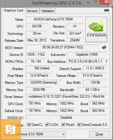 Cравнивать производительность P35K мы будем с другим ноутбуком Gigabyte — P34G. В обоих ноутбуках установлен один и тот же процессор (который, тем не менее, может работать немного по-разному, в зависимости от эффективности охлаждения и, соответственно, частоты доступной для алгоритма Turbo Boost). GIGABYTE P34G оснащён видеокартой GeForce GTX 760M, которая отличается от GTX 765M только частотами графического ядра. Оперативная память, как правило, не оказывает существенного влияния на производительность современных компьютеров, но стоит учитывать, что P35K оснащен не только большим объемом, но и двумя модулями, подключенными в двухканальном режиме доступа, тогда как память P34G работает в одноканальном режиме и имеет меньшую ёмкость.