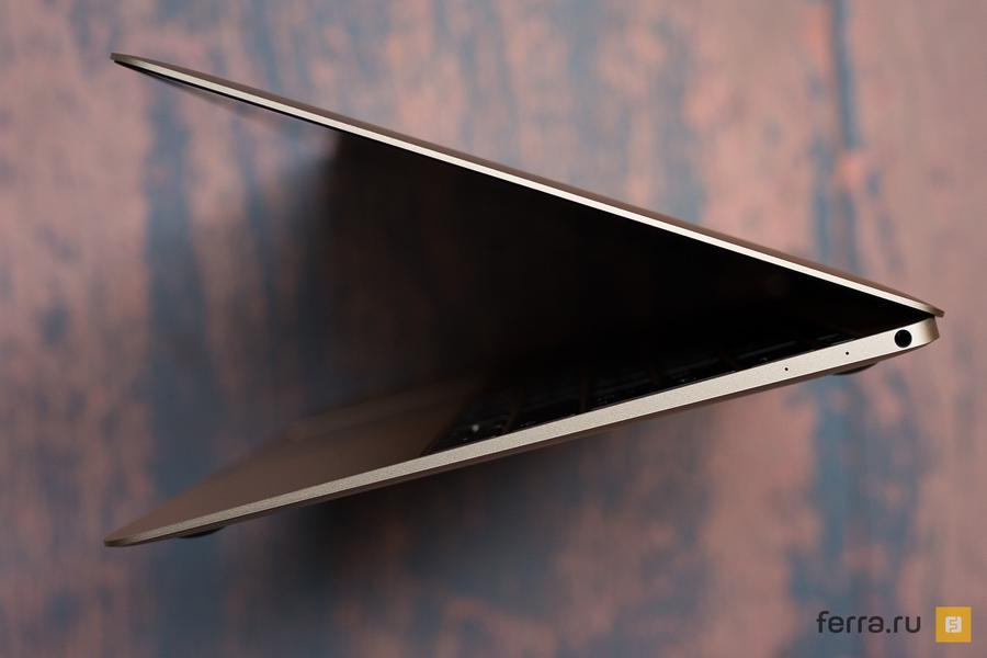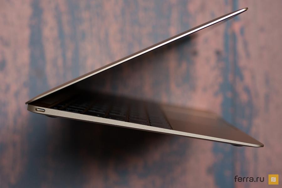Несмотря на то, что диагональ экрана здесь больше, чем у MacBook Air 11, корпус получился компактнее, легче и даже тоньше (1,3 см в самом толстом месте против 1,7 у MacBook Air). Разница в весе достигает 160 граммов. Но это заметно лишь при прямом сравнении, при переходе с MacBook Air  11 на новый MacBook вы вряд ли почувствуете разницу.