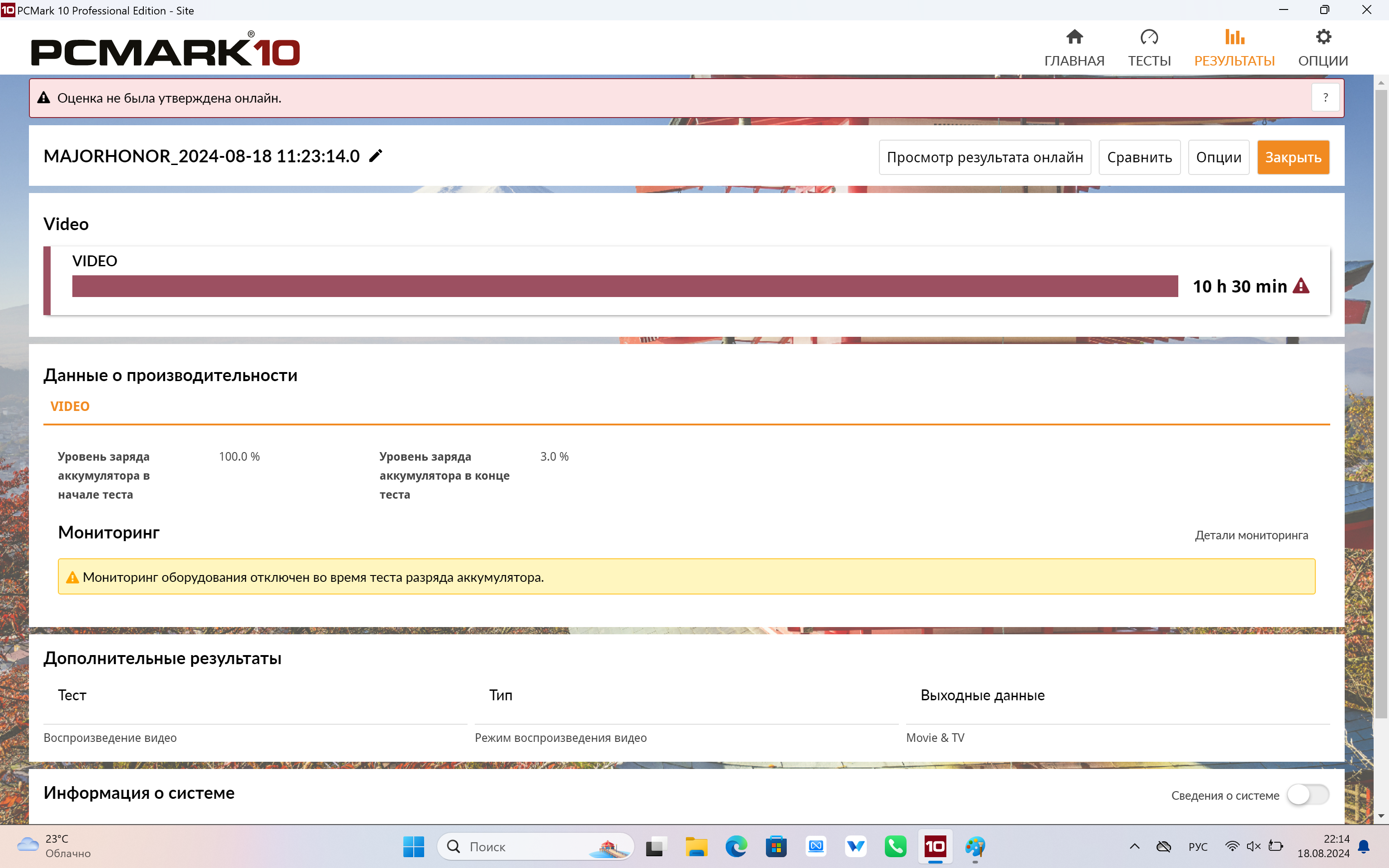 Что касается автономности, то работает ноутбук долго, но это уже не особо удивительно. Большинство последних протестированных мной моделей в самых разных категориях как раз выдерживали около 10 часов в среднем. По тесту PC Mark с яркостью экрана 150 кд/м2 (комфортная яркость в помещении) получилось 9 часов 42 минуты в режиме «современный офис» (тест имитирует работу офисного сотрудника: документы, таблицы, немного видео), а в режиме «просмотр видео» — 10 с половиной часов.