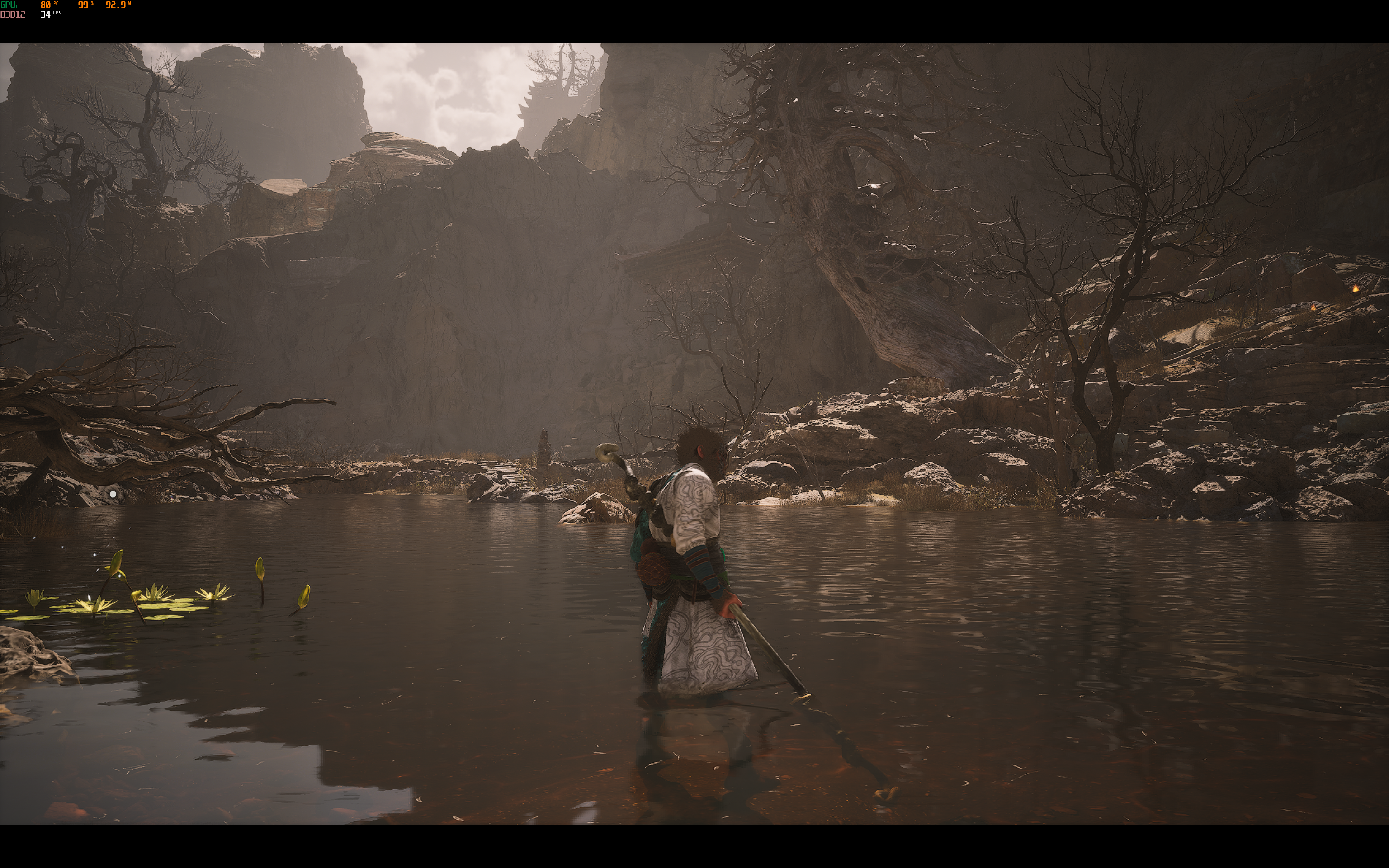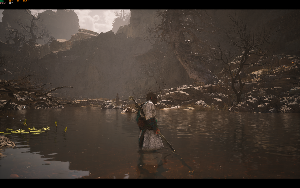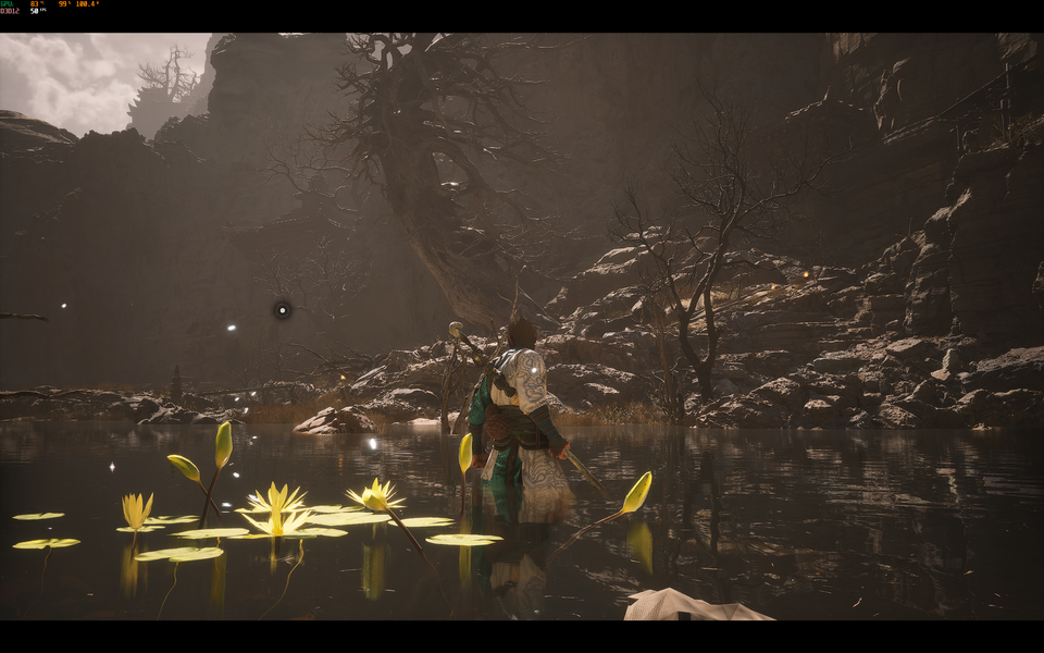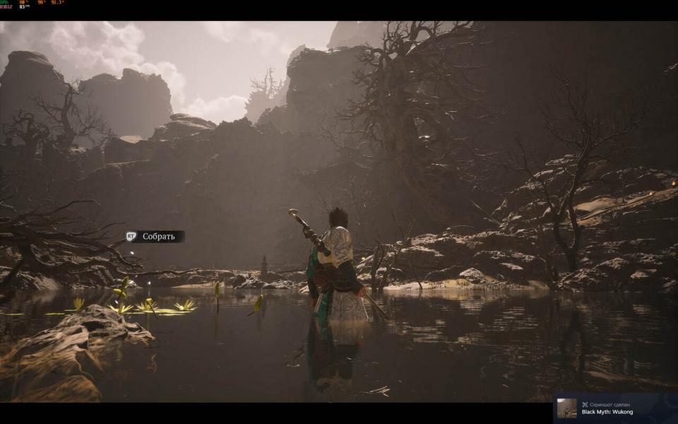В Blackmyth: Wukong я включил DLSS (играть в разрешении экрана ноутбука без DLSS — та ещё затея) и опробовал различные настройки графики. Если поставить «Реалистичный» пресет и включить среднее качество RTX (трассировка лучей), то фреймрейт в разрешении 3072x1920 держится на уровне 32–38 FPS в режиме максимальной производительности ноутбука.