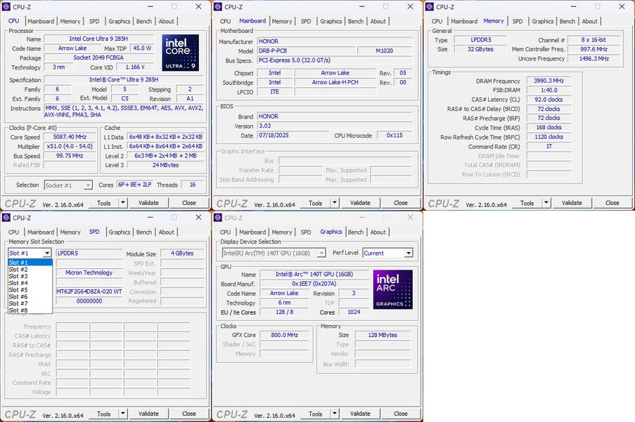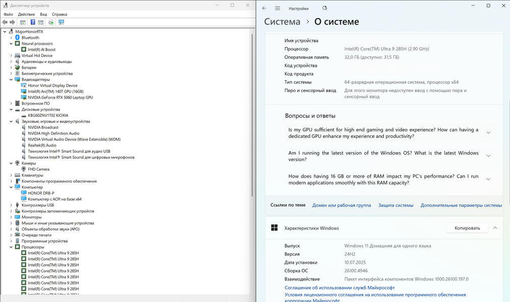 Ну а теперь о главном. Настолько мощных ноутбуков HONOR ещё никогда не выпускал: топовый процессор Intel Core Ultra 9 285H, дискретная видеокарта NVIDIA GeForce RTX 5060 Laptop, 32 Гбайт оперативной памяти LPDDR5x 8000 МГц (распаяна) и терабайтный накопитель на шине PCIe 4.0 (есть и второй, уже свободный слот M.2 2242 для установки дополнительного накопителя).