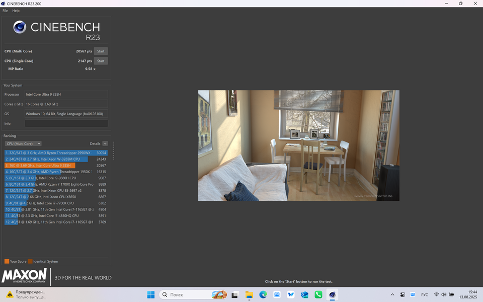В бенчмарках ноутбук показал себя просто прекрасно. Особенно в Cinebench R23, где процессор Intel Core Ultra 9 285H значительно обошёл флагманские десктопные процессоры прошлых поколений. Если сравнивать с макбуками, то по данным NotebookCheck в этом тесте 12-ядерный Apple M4 Pro отстаёт на 2%, а 14-ядерный M4 Pro производительнее на 19%. Ну и Ryzen 7 7700 среди процессоров настольных компьютеров медленнее, кстати.