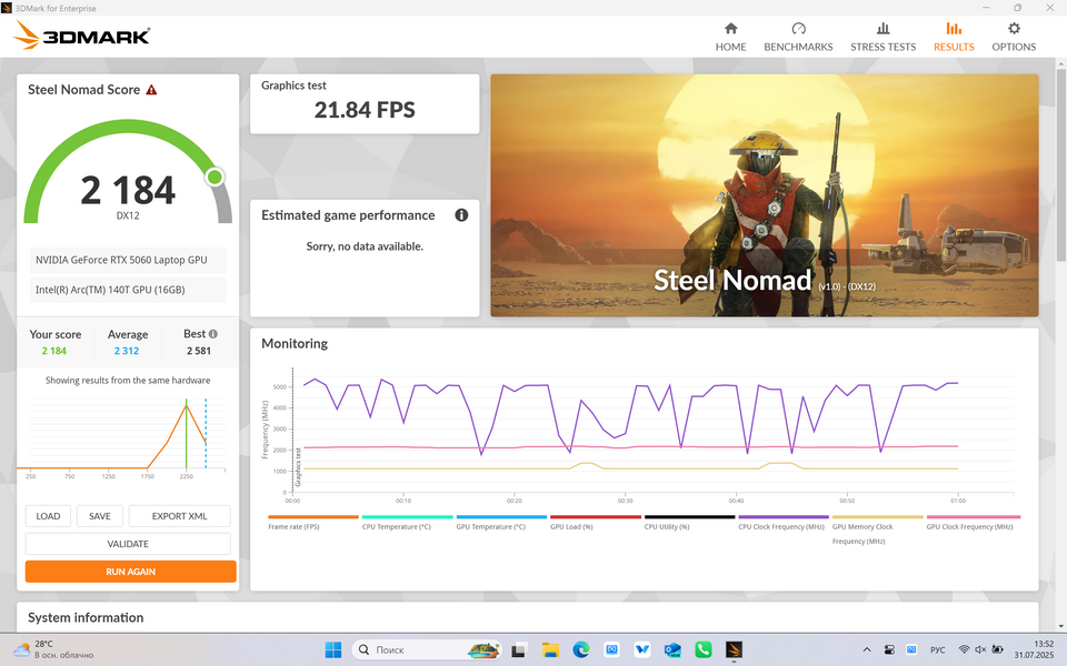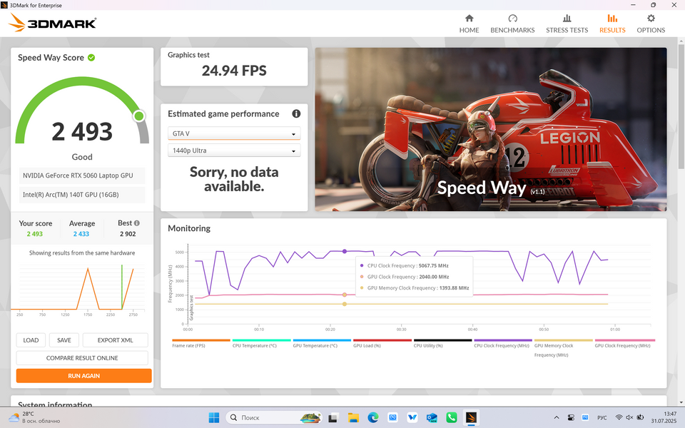 Ноутбучная RTX 5060 — это такая видеокарта, которая тянет ВООБЩЕ ЛЮБЫЕ игры в 1080p на ультра-детализации с рейтрейсингом и даже без включения DLSS и генерации кадров при 60+ кадрах в секунду. Если включить DLSS, то будет вам и 120, и 140 кадров в секунду. В 1440p она тянет подавляющее большинство игр на высоких настройках, но частота кадров уже снижается до 45-48 без DLSS составляет 70+ fps в любом случае.