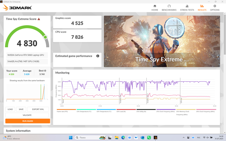 Интересный момент: в ноутбуке, по сути, установлены сразу два достаточно производительнных видеоускорителя. Один из них — дискретная RTX 5060 Laptop, а второй — Intel Arc 140T, встроенный в процессор. Стандартное программное обеспечение от производителя имеет режимы для эффективной эксплуатации обеих карт в зависимости от потребностей пользователя.