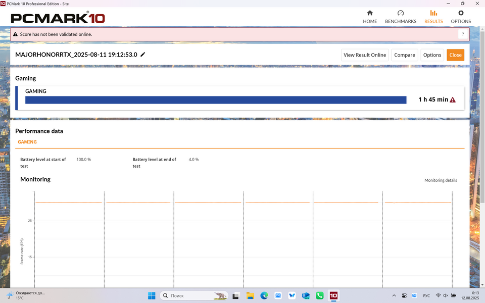 В HONOR MagicBook Pro 16 HUNTER используется батарея 75 Вт⋅ч. Для тестирования автономности ноутбука я выставил яркость экрана на 200 кд/м2 (более чем достаточно при работе в помещении даже если вы сидите возле окна), включил максимальную частоту обновления экрана — 165 Гц, установил умный режим производительности и оставил включёнными две видеокарты (спойлер: в тесте, разумеется, была задействована только встроенная видеокарта — так решила автоматика, но я должен был проверить).