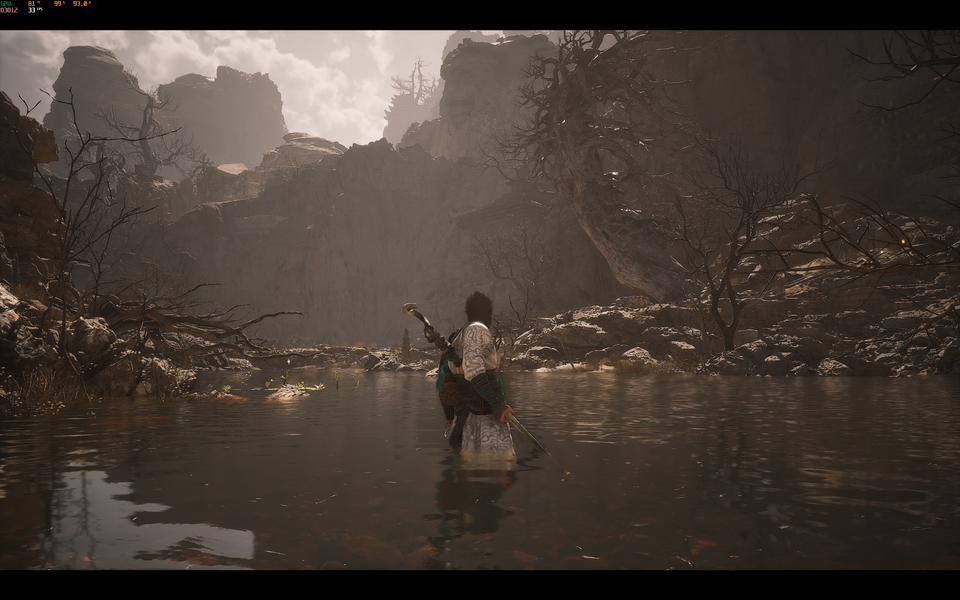 Я опробовал The Elder Scrolls IV: Oblivion Remastered, Roadcraft, Monster Hunter Wilds и Blackmyth: Wukong, но уже в нативном для ноутбука разрешении 3072x1920. Последняя особенно интересна для теста поскольку предлагает гибкие настройки и при этом на максимальных настройках действительно выглядит круто и реалистично, в отличие от Monster Hunter Wilds, которая даже на моём десктопном ПК смотрится отвратительно и хуже Monster Hunter World прошлого поколения. Более того, я так и не смог не понижая серьёзно настройки добиться стабильных 60 FPS в MH Wilds, но то же можно сказать и про мой десктоп (Ryzen 7 7700 + RTX 4070 Ti Super). Уж очень плохая у этой игры оптимизация.