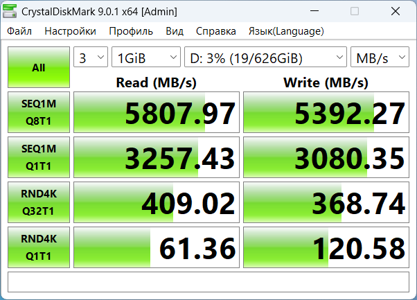 В качестве накопителя в тестовом экземпляре стоял SSD YMTC PC41Q-1TB-B ёмкостью 1 Тбайт. Соответственно, память QLC YTMC (логично) 4-го поколения, безбуферник. Несмотря на то, что это не WD или Samsung или даже не Adata, скорости, как видите по тестам, приличные: 5800 Мбайт/с чтение и 5400 Мбайт/с — запись. Честный PCIe 4.0. Разумеется, есть и более крутые SSD, но никто из производителей не предустанавливает более крутые SSD в ноутбуки, за исключением каких-нибудь бешено дорогих (не на RTX 5050, а на 5070 Ti или 5080/5090) игровых ноутов.