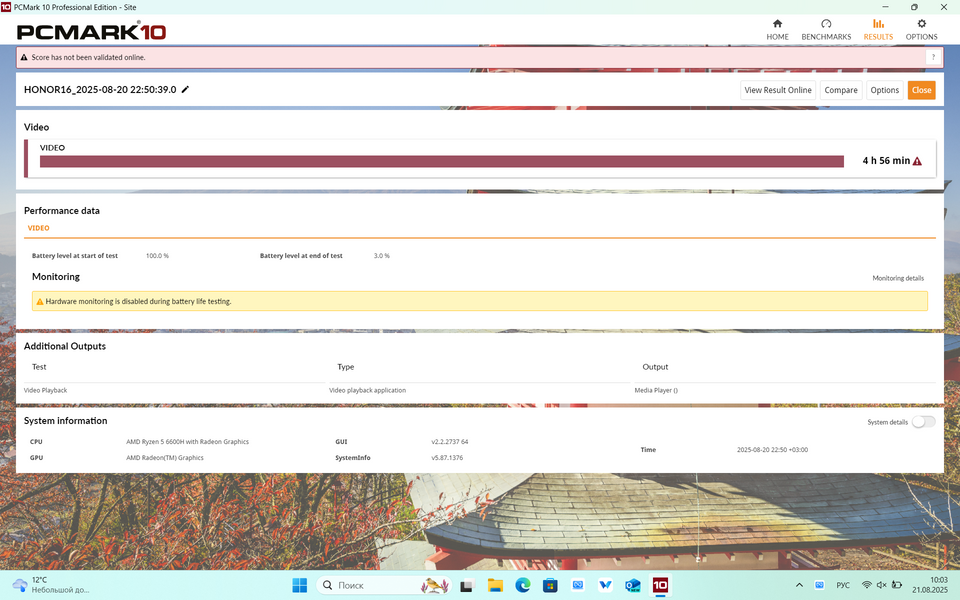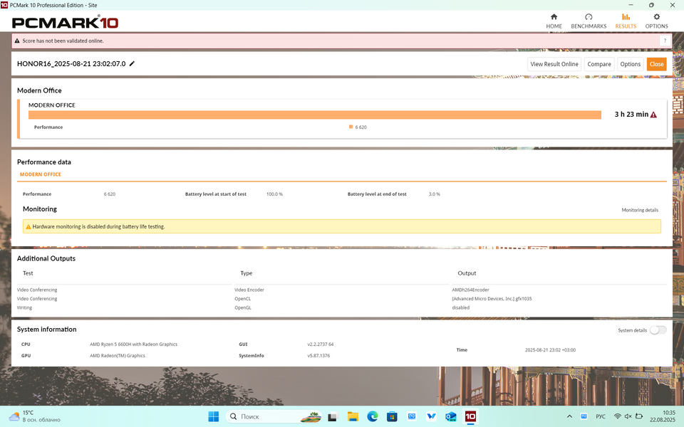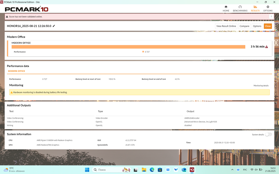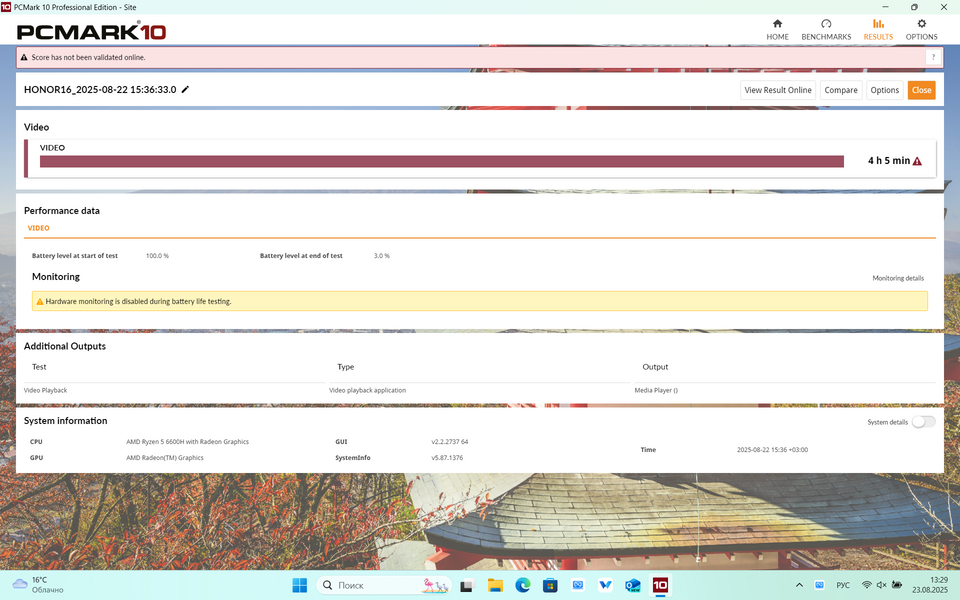 И она есть — это автономность. В принципе, батарея на 42 Вт*ч — это для 16" мало даже «на бумаге». В тесте PC Mark 10 с яркостью экрана 200 кд/м2 ноутбук проработал 5 часов в режиме просмотра видео и 4 часа в режиме имитации офисной работы. С полной яркостью цифры, разумеется, ещё скромнее: 4 часа видео и чуть менее 3,5 часов офисной работы.