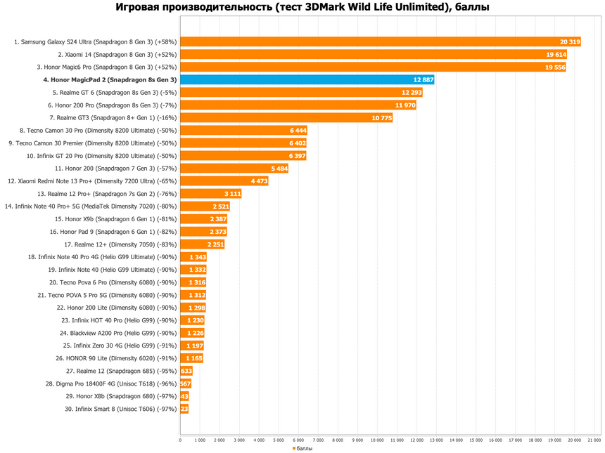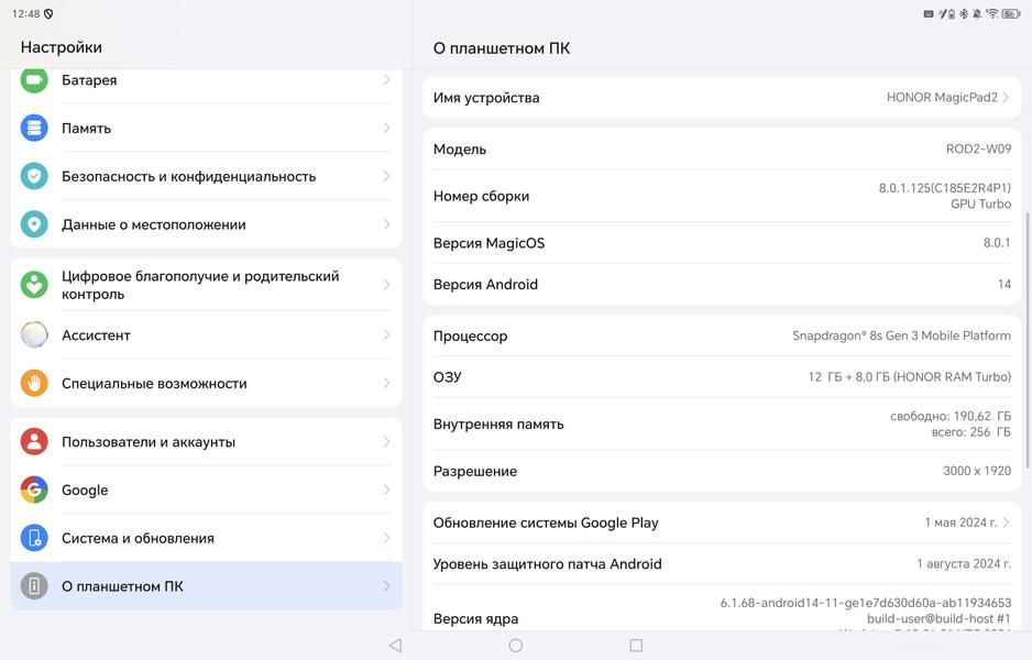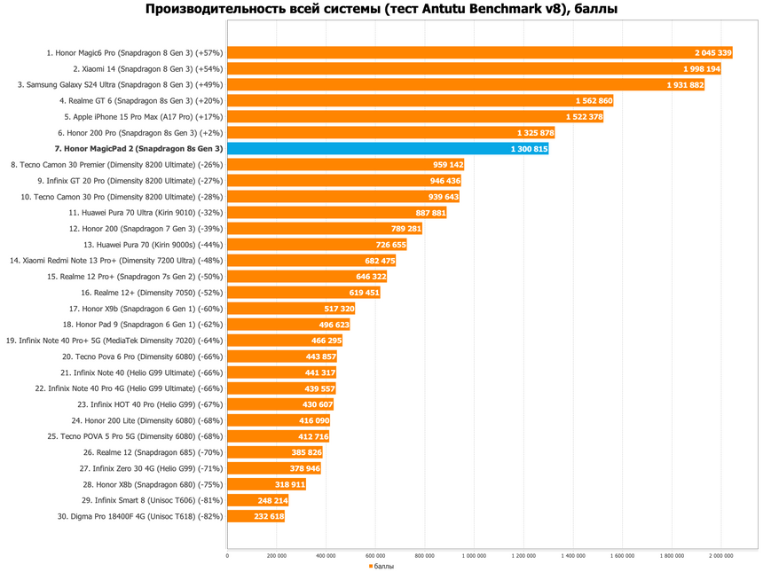 Как флагманский продукт, HONOR MagicPad 2 оборудован одним из самых производительных процессоров на рынке — Qualcomm Snapdragon 8s Gen 3. И вы скажете, что: «Ну, это не самый топ — есть ведь ещё более быстрый Snapdragon 8 Gen 3?». Да, он есть, но ни в флагманских Samsung, ни в Huawei, ни в Xiaomi его не устанавливают. Этот процессор встречается только в OnePlus Pad 2 (он же Oppo Pad Pro), планшете с IPS-дисплеем и скорее игровой направленностью. И в чисто игровом ZTE nubia Red Magic Nova — тоже IPS, игровая подсветочка на корпусе и прочие свистоперделки.