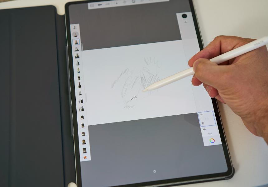Планшет поддерживает ИИ-функции в области обработки изображений. Например, можно удалить нежелательный объект с фотографии, обведя его стилусом. Планшет сам распознает объект, который нужно удалить, и дорисует фон.