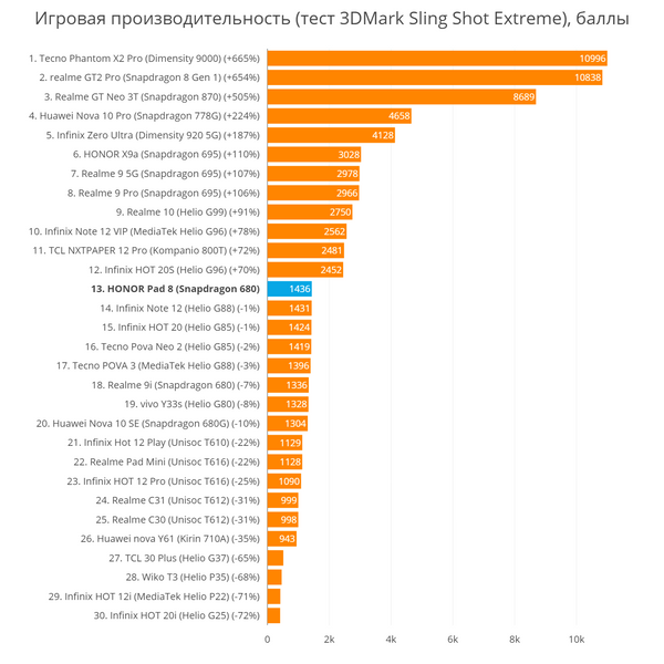 Всё это не превращает HONOR Pad 8 в «гоночный-экстремальный» по скорости работы планшет, но де-факто Snapdragon по ощущениям и потенциалу гораздо ближе к процессорам среднего класса, чем кажется на графиках. И работает достаточно быстро, чтобы у вас и приложения открывались без притормаживаний, и 4K-видео крутилось запросто.