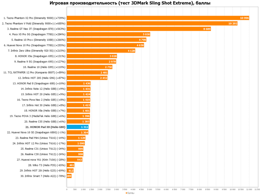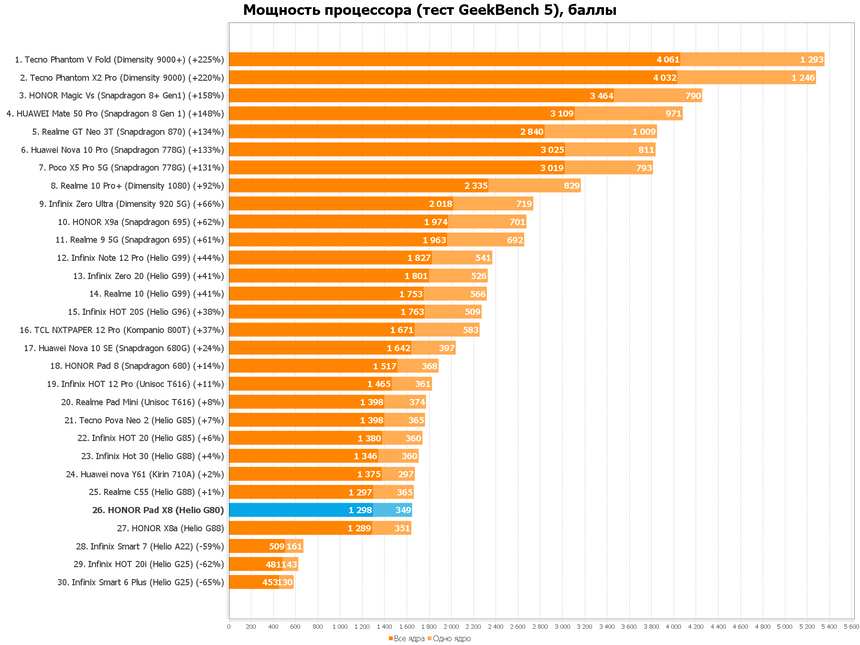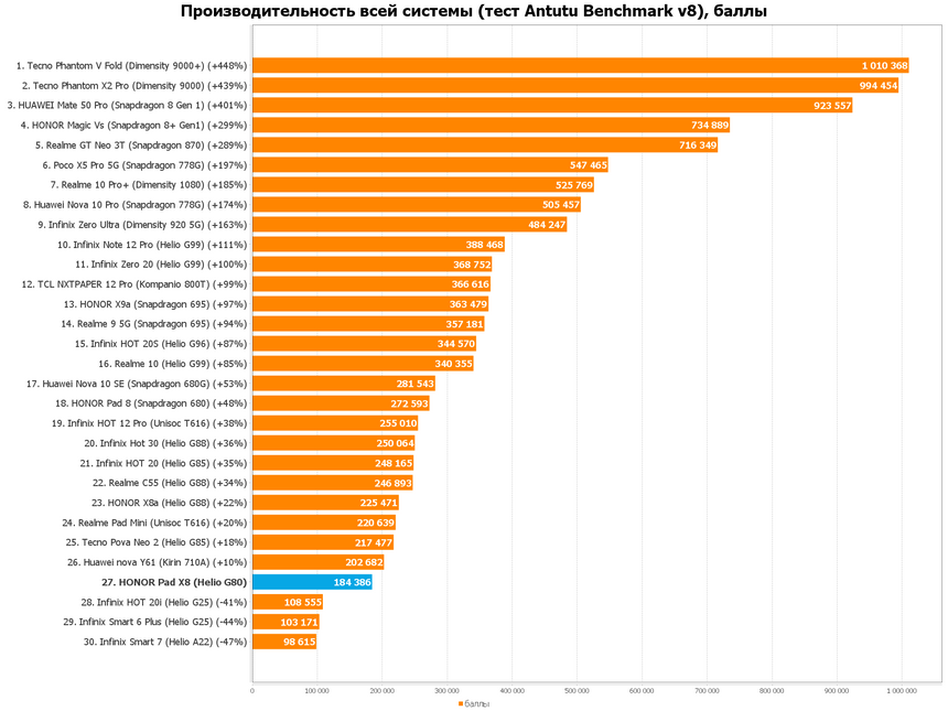 Ну а у нас в таблицах, понятное дело, смартфоны всех ценовых сегментов в одном графике по принципу «победит дорожайший», так что в этом плане особо не парьтесь, глядя в этот табель о рангах. Ведь на самом деле более быстрых планшетов до 15 тысяч рублей в сравнении с HONOR Pad X8 на российском рынке в сетевых магазинах нет.