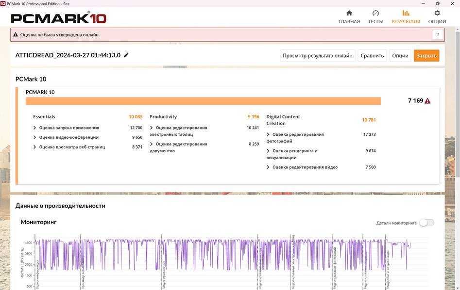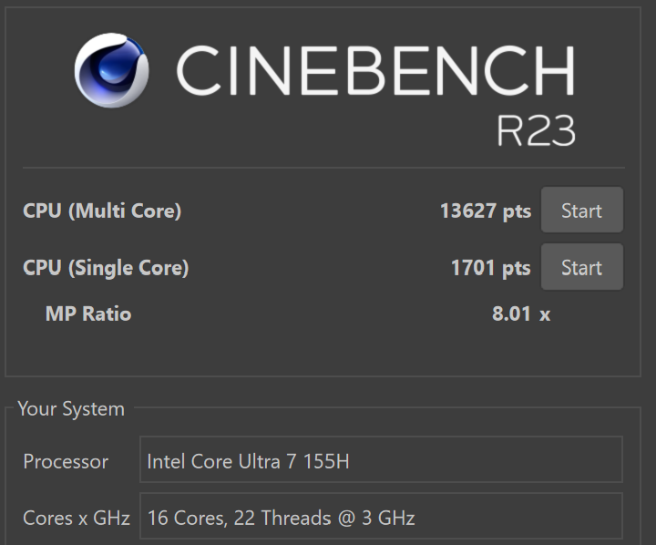 Память и накопитель под стать процессору: 32 ГБ LPDDR5 и SSD до 2 ТБ на PCIe 4.0. По производительности 155H примерно на уровне Ryzen 7 7840HS, и PCMark это подтверждает. В рендеринге и монтаже он уверенно обходит предыдущие поколения мобильных Intel.